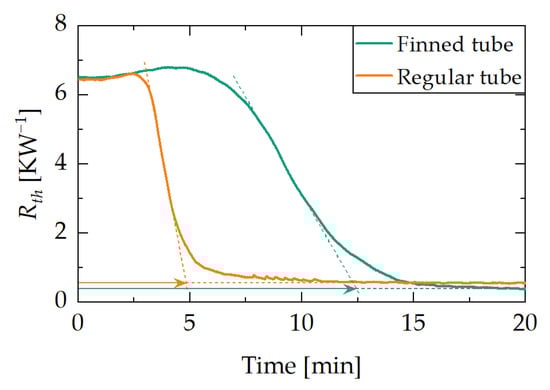 Figure 8 compares the results of the jump experiment in vertical orientation (ϕ = 90°) with the demonstrators D1 and D2, each loaded with 6 g of water. The graph shows the heat pipe’s thermal resistance plotted against time. It can be observed that the finned tube adsorbent reservoir demonstrator D2 reaches its minimum thermal resistance significantly faster than the regular tube adsorbent reservoir demonstrator D1. The switching time is interpreted as the duration between the start of the temperature jump and the point at which the inflection tangent of the jump response intersects the level of minimum thermal resistance (see lines in Figure 9). Hence, demonstrator D2 has a lower switching time than D1.
