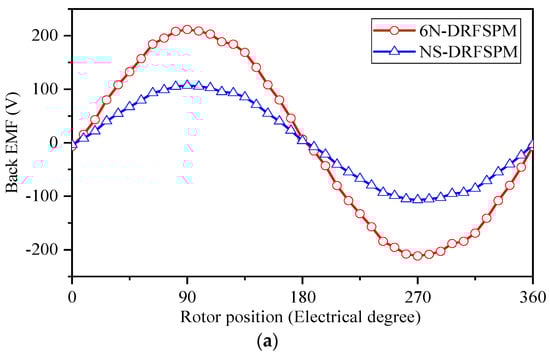 Figure 11 depicts the no-load phase back-EMF waveforms and their corresponding harmonics of the two proposed machines at a rotating speed of 1500 r/min. It can be seen that the amplitude of the peak fundamental phase back-EMF in the 6N-DRFSPM machine is remarkably larger than that in the NS FSPM machine, by about 2 times, which corresponds to the no-load flux linkage in Figure 8. This is because there are more self-loops in the magnetic field of the NS-DRFSPM machine due to different magnetization methods, which results in less effective flux linkage going through the coils of phase A′ and phase A″ than in the 6N-DRFSPM machine. Meanwhile, the total distortion rates (THDs) of the phase back-EMF waveforms of the 6N-DRFSPM and NS-DRFSPM machines are 4.98% and 5.56%, respectively.