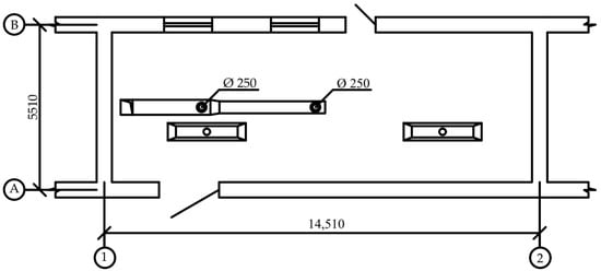 The considered space is a production building, originally equipped with a traditional water heating system, located in Lviv city in Ukraine (Figure 2), an area with a Central European climate that is of interest due to the increasing need for cooling in summer and the large differences between summer and winter outdoor air temperatures. The naturally ventilated facility was built in 1995 and consists of one floor. The volume of the building is 245 m3, while the usable area is 70 m2 (5 m × 14 m). The window surface area was calculated as about 9.7 m2. During the cold season, a temperature tin of 18 °C is maintained indoors, while in warm season, a supply temperature of 23 °C and exhaust of 26 °C are designed. The layout of the investigated space, including the locations of two infrared heaters and two TFADs, proposed as a thermomodernization options, is presented in Figure 3. The internal walls are on axes 1 and 2, and the external walls are on axes A and B.