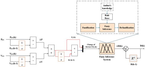 Fuzzy Logic Control (FLC)-based MPPT is a soft computing technique used under uniform insolation and varying weather conditions. FLC has the benefit of not requiring an analytical representation of the system [36]. The FLC operation is built up based on three main components: defuzzification, rules inferences, and fuzzification. Its two inputs are the error (Er) and the change in error (CEr) as mentioned in Figure 3. The incremental duty cycle is the output (∆D) of the fuzzy logic controller for MPPT, and it can have either positive or negative values depending on the location of MPP point. This value will be transmitted to the boost converter. The duty cycle value will be determined by: