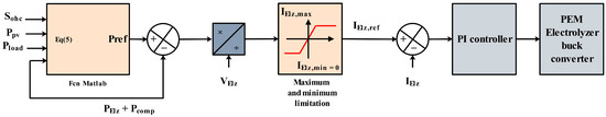 Water electrolysis presents a promising and clean pathway for producing pure and green hydrogen; it is a sustainable alternative [37]. In this paper, as mentioned in Equation (5), any extra energy produced by the PV system is, at any given time, sent to the electrolyzer and the compressor when the hydrogen tank does not reach its maximum pressure, where it is used to create hydrogen, which is subsequently sent to the hydrogen storage tank. The Buck Converter’s control mechanism is depicted in Figure 4.