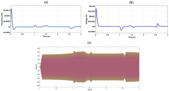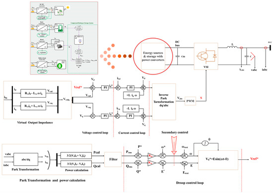 - A primary control, a type P/F, and Q/V droop control with a virtual output impedance, and a centralized secondary control are used to generate the referenced voltage and frequency of the islanded microgrid. The studied system is presented in Figure 2.
