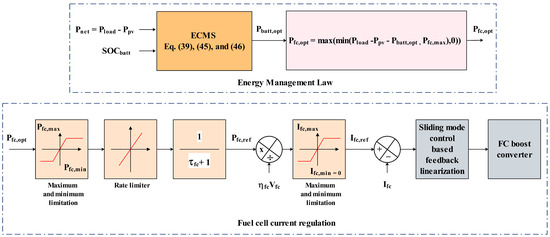 The ECMS energy management implementation in Matlab/Simulink is shown in Figure 9 and the PEM fuel cell reference current can be generated using Equation (47).