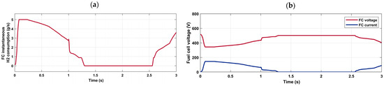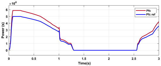 The constant µ serves as a balance coefficient to limit the battery’s SOC value between and . It can be adjusted to accurately match the charge and discharge characteristics of the battery [45]. The fuel cell power is calculated as: