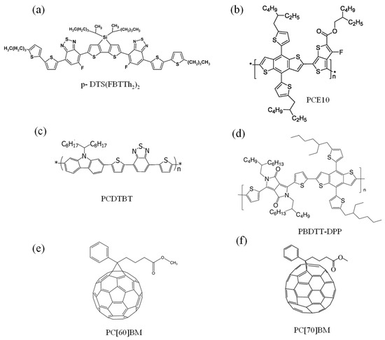 Chemical molecular structure and abbreviations of organic donor and acceptor materials used for organic solar cells: (a) DTS(FBTTh2)2; (b) PCE10; (c) PCDTBT; (d) PBDTT-DPP; (e) PC[60]BM; and (f) PC[70]BM.