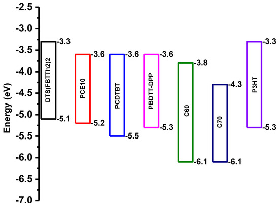 HOMO and LUMO energy levels of different donor–acceptor molecules viz. DTS(FBTTh2)2, PCE10, PCDTBT, PBDTT-DPP, PC[60]BM, PC[70]BM, and P3HT.