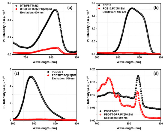 To access the evidence of exciton dissociation efficiency, a photoluminescence (PL) measurement was performed in the pristine and blend forms of all above-mentioned polymers as depicted in Figure 4. The excitation wavelength was guided through the absorption spectrum (Figure 3) for each type of polymer. Figure 4a shows the PL spectrum of DTS(FBTTh2)2 and DTS(FBTTh2)2:PC[70]BM. With the excitation wavelength of 600 nm, the emission spectrum is located in the range of 700 nm to 850 nm.