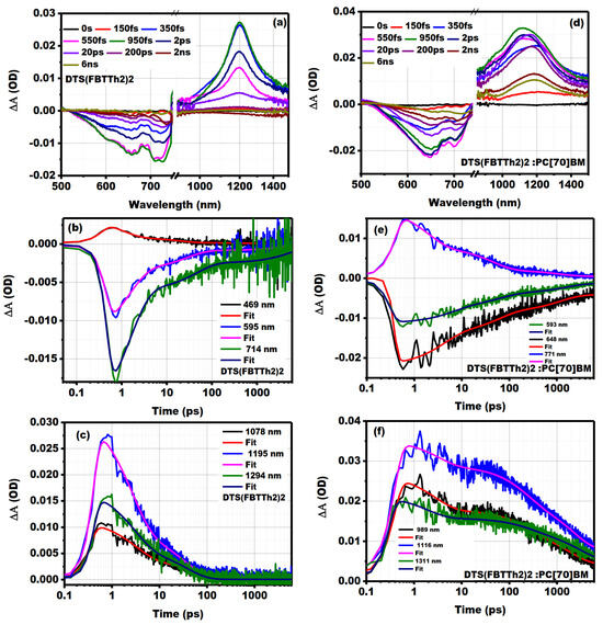 Here, a detailed discussion is presented regarding charge carrier generation in the above-mentioned donor–acceptor molecules. The ultrafast transient absorption spectroscopy (UTAS) technique is applied to present the basic principle of carrier dynamics in polymeric films. Figure 5a–f corresponds to the UTAS experiment results taken for DTS(FBTTh2)2 and DTS(FBTTh2)2:PC[70]BM. The decay-associated spectra is recorded for DTS(FBTTh2)2 from 0 s to 6 ns with 480 nm pump excitation for visible and NIR. The ground state bleaching (GSB) occurs immediately after the excitation ranging from 550 nm.