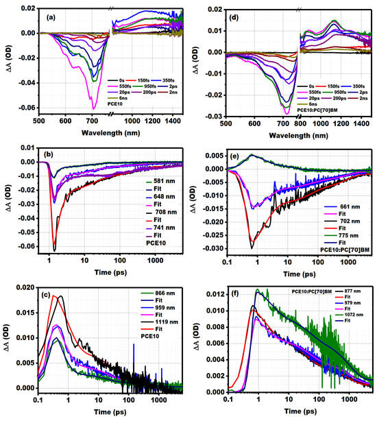 The relative differential absorption spectra (ΔA(OD)) with respect to the wavelength ranging over visible to NIR at various probe delay times and decay kinetics. (a) ΔA(OD) for PCE10; (b) decay kinetics for PCE10 in visible spectrum; (c) decay kinetics for PCE10 in NIR spectrum; (d) ΔA(OD) for PCE10:PC[70]BM; (e) decay kinetics for PCE10:PC[70]BM in visible spectrum; and (f) decay kinetics for PCE10:PC[70]BM in NIR spectrum.