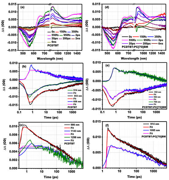 The relative differential absorption spectra (ΔA(OD)) with respect to the wavelength ranging over visible to NIR at various probe delay times and decay kinetics. (a) ΔA(OD) for PCDTBT; (b) decay kinetics for PCDTBT in visible spectrum; (c) decay kinetics for PCDTBT in NIR spectrum; (d) ΔA(OD) for PCDTBT:PC[70]BM; (e) decay kinetics for PCDTBT:PC[70]BM in visible spectrum; and (f) decay kinetics for PCDTBT:PC[70]BM in NIR spectrum.