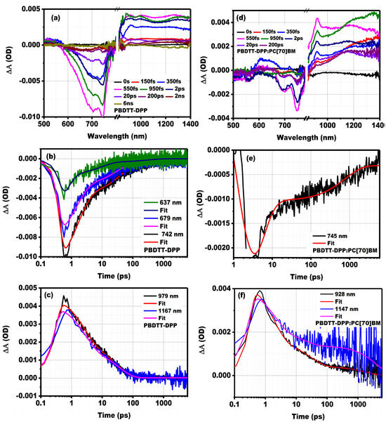 Figure 8 represents the UTAS measurement result for another important organic molecule, i.e., PBDTT-DPP and PBDTT-DPP:PC[70]BM. The PBDTT-DPP is an NIR light-sensitive polymer. It has strong photosensitivity at 600 to 750 nm; therefore, the GSB occurs in this range with a decay time of 28 ps, as given in Table S4. It also exhibits a very broad PIA signature ranging from 850 nm to 1500 nm. Around 550 fs, the maximum GSB peak is observed, similar to the previous organic molecules.