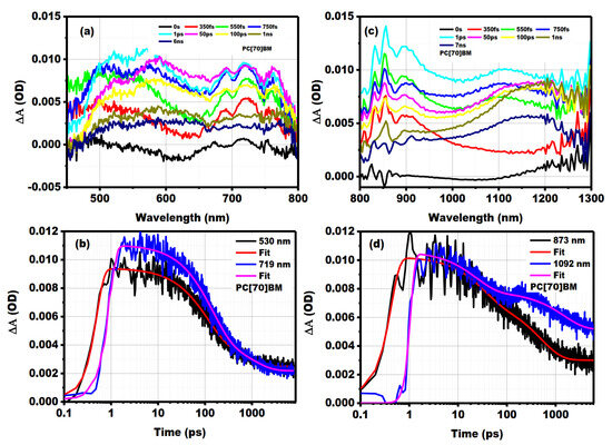 The soluble fullerene derivative [6,6]-phenyl C60 butyric acid methyl ester (PC[60]BM) and the similar C70 (PC[70]BM) have been ubiquitously used as acceptors. In this section, the photophysical properties of PC[60]BM and PC[70]BM have been discussed with the help of UTAS measurements. Their absorption profiles have already been discussed in Figure 3.
