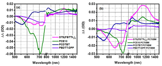 The lifetime of these singlet excitons are in the range of 1 ns as depicted in Table S5. Some studies also show that PC[60]BM mixed with polystyrene (PS) may produce triple excitons through intersystem crossing [41]. The PIA around 500 nm has been assigned to an electroabsorbance signal deriving from the high polarizability of C60 [42]. The PIA in the NIR region in the range of 800 to 1200 nm occurs due to the fullerene anion absorption [43]. These spectral features are the indication of charge generation rather than neutral exciton formation in the PC[60]BM film. The signal around 725 nm has been attributed to the triplet formation in the presence of oxygen as the experiment is performed in the ambient condition [41]. Bernado et al. have reported that the high dielectric screening in the fullerene nanocrystal produces a delocalized CT state dissociation [44]. The low dielectric constant of PCBM (3.9) increases the spatial separation in the molecule, which reduces the electronic interaction that results in the relatively localized and more strongly bound excitons in the blend film [45]. In Figure 10, the UTAS measurement of PC[70]BM has been given, and the pump wavelength was kept similar to the PC[60]BM. In the PC[70]BM, a much broader PIA is observed in the visible region ranging from 450 to 800 nm due to the better absorption in the visible region. The maximum decay at 719 nm is observed up to 973 ps. In the NIR region, PC[70]BM exhibits broad absorption, which indicates a better generation of charge carrier in the pristine film compared to the PC[60]BM. In both PCBM molecules, the ability to separate charges may also be related to the dependence of PCBM LUMO level upon aggregation states, with local deviations in the degree of crystallization providing an energetic offset to favor charge separation. The overall comparative representation of UTAS measurement response for pristine polymers and their blend with fullerene is shown in Figure 11a,b. The transient absorption of pristine polymers shows the GSB in different wavelength ranges according to their static absorptions. The DTS(FBTTh2)2 and PCE10 have a much broader GSB signature compared to the other polymers containing a larger coverage of visible spectrum.