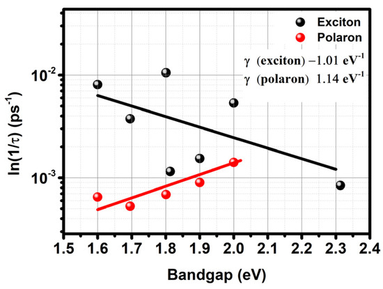 Figure 12 represents the plot of the natural logarithm of the inverse of exciton and polaron lifetimes vs. the optical bandgap of all polymers mentioned earlier as given in Table 1. This allows us to test the Energy Gap Law for polymers. According to the Energy Gap Law, the slope of the linear fit gradient (γ) is subject to the geometrical rearrangements experienced by the polymers during the non-radiative decay from the excited to the ground state. The value of gradient (γ) for excitons and polarons is subsequently found to be −1.1 eV−1 and 1.14 eV−1 [9]. Thus, it suggests that the exciton decay to the ground state in the above-mentioned photo-activated polymer is likely to involve a high distortion of polymer equilibrium geometries. This observation supports the basis of the Stokes shift found in the conjugated polymers due to the high disorder.
