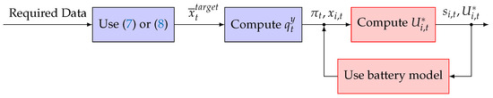 - is a coefficient, at time t, common to all BEVs which penalizes any distance from y. Then, is the pressure field that would give priority to the less-full BEVs upon arrival. It would be calculated in the reverse engineering mechanism (called inverse Nash) [27,28,45] detailed in Appendix A, the aim of which is to reduce the standard deviation in the states of charge of BEVs at the end of charging or discharging. It is that creates the link between agents (here, BEVs) in the game (i.e., as the mean field).