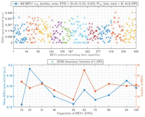 (Top)—The SOCs of 400 BEVs’ upon arrival () ordered according to their capacities, , with kWh; (bottom)—mean SOCs per battery capacity upon arrival () and number of BEVs per battery capacity (). Note that more detailed data are reported in Appendix C in the case of charging.