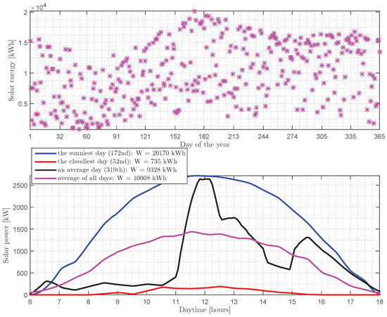 (Top)—daily solar energies (W) in 2020; (bottom)—daily solar power curves () for three days in 2020 (sunniest, cloudiest, average) and the yearly average solar power curve.