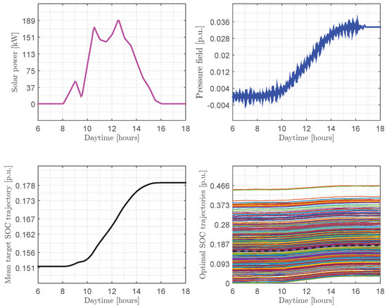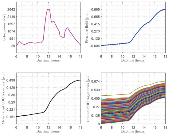 Average day in the case of charging: (top left)—daily solar power curve (); (bottom left)—mean target SOC trajectory (); (top right)—pressure field (); (bottom right)—400 BEVs’ optimal SOC trajectories () and empirical average SOC per BEV (), dotted line.