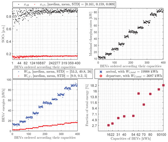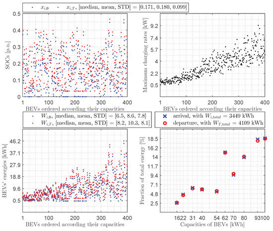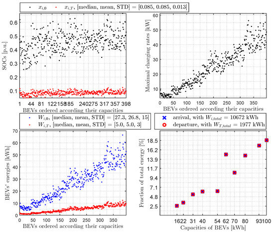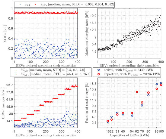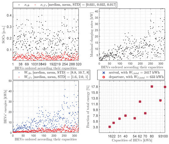 Average day in the case of charging: (top left)—400 BEVs’ SOCs upon arrival () and upon departure (); (top right)—400 BEVs’ maximum charging rates (); (bottom left)—400 BEVs’ energies upon arrival () and upon departure (); (bottom right)—fractions of total energy per BEVs’ capacity upon arrival () and upon departure ().