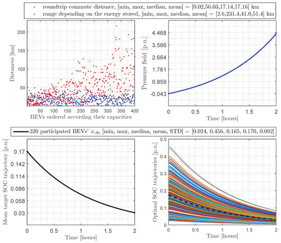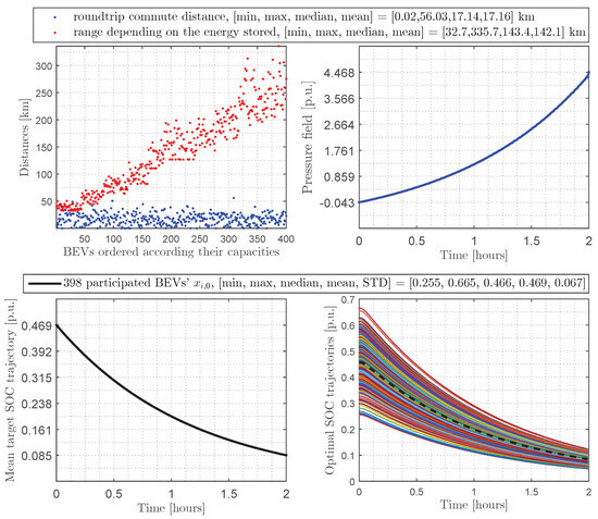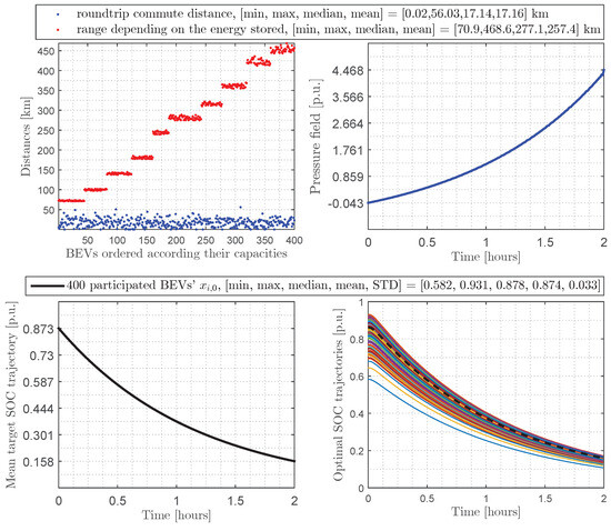 Sunniest day in the case of discharging: (top left)—400 BEVs’ roundtrip commute and range distances; (bottom left)—mean target SOC trajectory (); (top right)—pressure field (); (bottom right)—400 BEVs’ optimal SOC trajectories () and empirical average SOC per BEV (), dotted line.