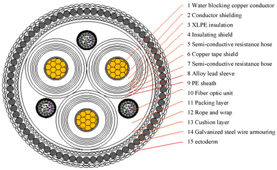 The structural profile of the cable is shown in Figure 1. The cable is composed of three conductive wire cores and three twisted optical fiber units. The inner parts of the wire core, from the outside to the inside, include the polyethylene (PE) sheath, alloy sheath, water-blocking semiconductive layer, copper tape shield layer, insulation shield, XLPE insulation, conductor screen, and water-blocking copper conductor. The wire core and optical fiber unit are wrapped in the filling layer, and the outer layer comprises the cable belt, armor cushion, galvanized steel wire armor layer, and outer layer.