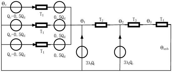The heat transfer characteristics of submarine cables can be analyzed using a thermal circuit and heat flow. Based on the similarity between the heat flow field and the current field, the method of calculating the physical quantities in the heat flow field can refer to the method of calculating the physical quantities in the current field. Metal materials have no hindering effect on heat transfer and can be equivalent to heat sources, while other materials have a hindering effect on heat transfer and can be equivalent to thermal resistance. In particular, since the insulating material also produces a certain loss, it is equivalent to a heat source with thermal resistance. When constructing the parallel thermal circuit model of a submarine cable, structural layers which have similar heat transfer coefficients and are in contact with each other can be merged to reduce the complexity of the model. The simplified internal thermal resistance of the submarine cable is mainly due to its insulation layer, lining layer, and outer layer; the external thermal resistance is mainly due to seabed soil; and the internal heat source is mainly due to the conductor, insulation layer, alloy lead sleeve, and galvanized steel wire armor. Thus, a parallel thermal circuit model of submarine cable [18] is constructed as shown in Figure 2.