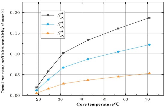 According to a sensitivity classification analysis of the thermal resistance coefficient of each structural layer of the submarine cable, when the other physical parameters are unchanged, the sensitivity of the thermal resistance coefficient of each structural layer of the submarine cable increases with an increase in the cable’s core temperature, as shown in Figure 3.