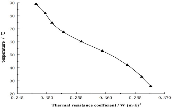 When using the IEC standard thermal circuit model to calculate the temperature of each layer of the submarine cable, the dynamic characteristics of the thermal resistance of each layer of the submarine cable’s structural materials are not taken into account, so the thermal resistance coefficient of each layer of the submarine cable is fixed. In view of the fact that the inner layers of the submarine cable are mainly composed of a crystalline polymer, the crystallinity of the crystalline polymer will change with an increase in the operating temperature of the submarine cable. When the operating temperature increases, the crystallinity value decreases, and the thermal resistance coefficient of the material also decreases. Now, a curve of the relationship between the operating temperature of the submarine cable and the thermal resistance coefficient of the material is established, as shown in Figure 4. Therefore, when using the IEC standard thermal circuit model to calculate the temperature of each layer of a submarine cable, it is necessary to dynamically determine the thermal resistance coefficient of each layer of the submarine cable so as to reduce data error and improve the subsequent accuracy of predicting submarine cable burial depth.