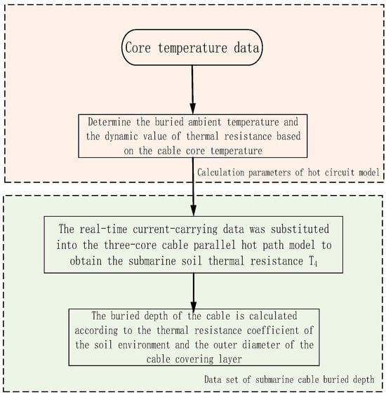 A temperature–burial depth calculation process for submarine cables is constructed, as shown in Figure 5. Firstly, the thermal resistance coefficient of each structural layer of the submarine cable is determined according to the temperature of the cable’s core, and then the environmental thermal resistance is calculated by inputting the real-time operation carrying capacity of the submarine cable into the parallel thermal circuit model of the three-core submarine cable. Finally, the burial depth of the submarine cable is calculated according to the outer diameter of the submarine cable.