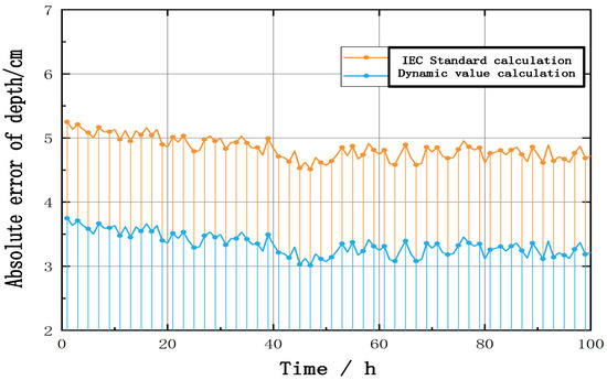 It can be seen from Figure 6 that there is an absolute error of about 5 cm between the burial depth of the submarine cable calculated according to the IEC standards and its actual burial depth, and there is an absolute error of about 3.5 cm between the burial depth of the submarine cable calculated according to the dynamic value of its thermal resistance and the actual burial depth. Therefore, it is proved that the method of calculating submarine cable depth based on the dynamic characteristics of its thermal resistance has high accuracy.