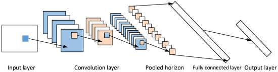 A CNN is a feedforward neural network with an excellent data feature learning ability. It is mainly composed of an input layer, a convolution layer, a pooling layer, a fully connected layer, and an output layer. The structure is shown in Figure 7.