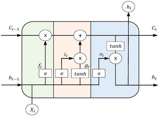 LSTM is a modified recurrent neural network. The LSTM structure is shown in Figure 8. Compared with CNNs, LSTM introduces the concept of a “gate” in the internal structure to control the internal unit. The LSTM network contains three gate structures: an input gate, a forget gate, and an output gate. By combining the extracted feature vector Xt, the state memory cell Ct−1, and the hidden layer state ht−1 with the forget gate ft, the parts of the state memory cell Ct−1 that need to be forgotten are determined. The eigenvector Xt in the input gate determines the vector to be retained in the state memory cell Ct−1 after the σ and tanh activation functions are applied [20].