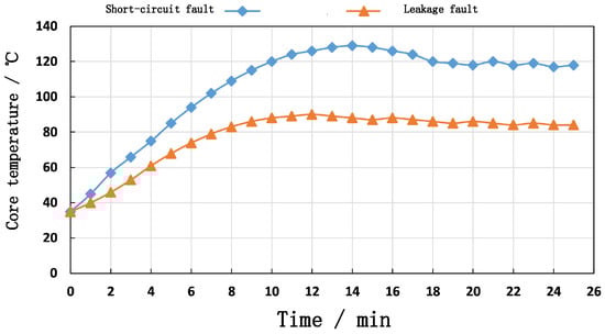 When a submarine cable is in a normal state of operation, due to the influence of ocean currents or silt deposition, the burial depth of the submarine cable is in a state of slow variation for a long time; even if there are sudden abnormal conditions, such as trawling, anchor dragging, and fishing activities, the submarine cable will remain in a single state after more obvious variations. When an electrical fault occurs in a submarine cable, the temperature of the cable’s core at the fault location will suddenly and sharply increase, and it will drive the temperature of the cable’s core to change along the fault location. When a submarine cable short-circuit fault occurs, the temperature of the cable’s core at the fault location will suddenly increase greatly, driving a change in the temperature of the cable’s core within a range of tens of meters along the fault location. When a submarine cable leakage fault occurs, the temperature of the cable’s core at the fault location will suddenly increase in a small range, driving a change in the temperature of the cable’s core within a range of several meters along the fault location, as shown in Figure 9. Because the variation in the cable’s core temperature caused by the variation in the burial depth of the submarine cable is much smaller than that caused by an electrical fault in the submarine cable, a sudden variation in the cable’s core temperature of the submarine cable can effectively eliminate the influence of the electrical fault in the submarine cable.