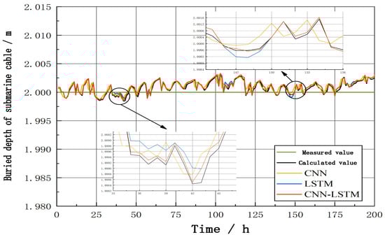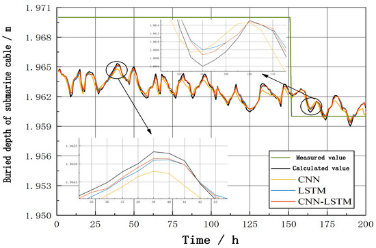 In order to further understand the burial depth of the submarine cable in the future in the short term, based on the characteristics of the cable’s core temperature data, two different types of cable core temperature datasets were selected to calculate the burial depth of the submarine cable. Then, the calculated burial depth value was preprocessed and used as input data for the CNN neural network, LSTM neural network, and CNN-LSTM neural network so as to obtain the trend in the burial depth changes of the submarine cable via different prediction models. The results are shown in Figure 12 and Figure 13.