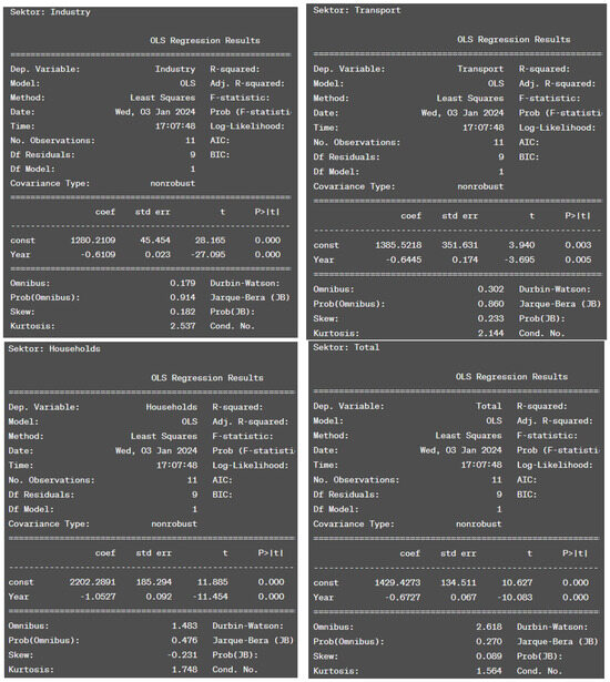 The efficacy of energy efficiency strategies in various sectors is corroborated by the OLS regression results, as depicted in Figure 1. The regression outcomes for each sector—industry, transport, households, and overall—furnish empirical proof of year-to-year fluctuations in the ODEX index. The results of the linear regression for the industrial sector demonstrate a high coefficient of determination of 0.988, indicating a strong fit between the model and the historical data. The p-value for the year variable is less than 0.05, indicating that it is statistically significant in the model. The regression coefficient for the year is −0.6109, indicating that, on average, industrial energy efficiency increases (ODEX decreases) by 0.6109 points for each year.