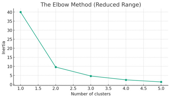 The application of cluster analysis to the grouping of years according to similarity in patterns of energy efficiency change can assist in the identification of periods exhibiting similar characteristics. Typically, cluster analysis commences with the utilisation of the elbow method to determine the optimal number of clusters. This method involves the plotting of inertia values (the sum of the squares of the distances of points from their nearest cluster centres) for different numbers of clusters, with the subsequent identification of the ‘elbow’—the point at which the increase in inertia decreases rapidly—as illustrated in Figure 2.