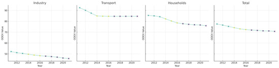 The index of energy efficiency, which serves as a measure of progress in improving energy efficiency at the national level, is expressed in percentage points [10]. The baseline value, taken as 100 points, refers to the year 2000. A decrease in the value of the ODEX index indicates an improvement in energy efficiency, as it indicates less energy consumption for the same or more production. These values permit the observation of trends and the comparison of energy efficiency between different sectors of the economy [11]. ODEX indicators represent a valuable tool in the analysis and management of energy efficiency, as they assist in the identification of areas where further energy savings and reductions in greenhouse gas emissions are possible [12].