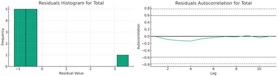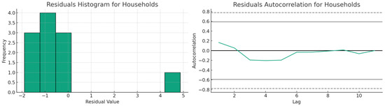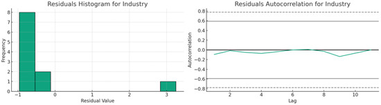 One of the fundamental aspects of regression analysis is the examination of residuals, which serves to ensure the model’s adequacy. The residual analysis for the industrial sector, which encompasses an investigation of the distribution of residuals and their autocorrelation, is depicted in Figure 4.