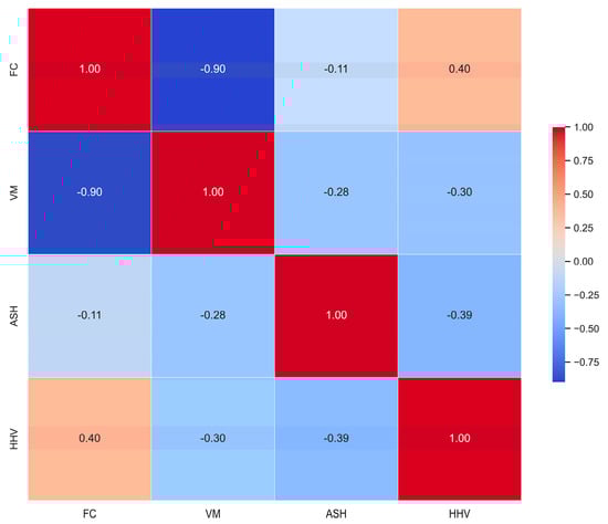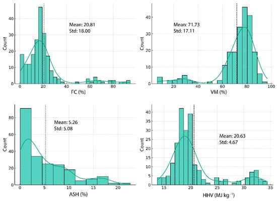 Data on FC, VM, ash, and HHV were collected from the available database of scientific literature [30,31,32,33,34]. Data were collected in semi-structured form, and a total of 872 data points were used for modeling, with all missing data and duplicate values removed. Data processing included cleaning, normalization, coding, and feature selection to improve the data structure and remove any obstacles that could affect the model’s ability to learn effectively. The collected data can be found in Supplementary Table S1.