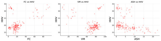 Figure 2 shows a scatter plot to determine the relationship between the input variables (FC, VM, and ash) and the output variables of the model (HHV).
