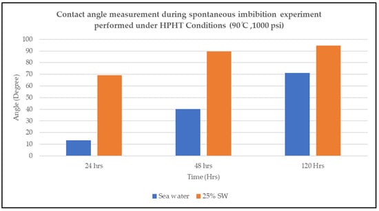 The initial wettability of the rock is crucial for oil recovery in LSWF. Although some studies [22] observed a decrease in interfacial tension (IFT) between oil and water using low-salinity brines, a clear link between IFT and enhanced oil recovery hasn’t been established yet. Therefore, to understand the impact of LSWF, measuring the contact angle (CA) is essential. This provides a baseline wettability before introducing different brines. In this study, the initial contact angle measured with seawater, oil, and rock was approximately 106°. Reproducible results confirmed this value, indicating the rock was very weakly water-wet at the outset. Figure 5 compares the rate of water imbibition into the rock using contact angle measurements over time. The findings align with previous research conducted under high-temperature conditions [5,19]. However, this study incorporated the additional factor of high pressure, which significantly accelerated the imbibition process.
