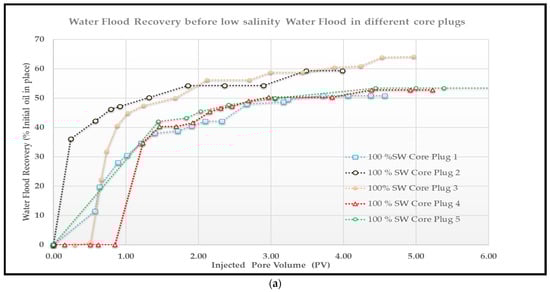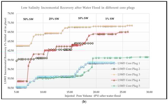 This study investigated the application of low-salinity water flooding (LSWF) for enhanced oil recovery (EOR) in reservoir zone E of Field A. A series of core flood displacement experiments was conducted in tertiary mode (i.e., after waterflooding) to assess the effectiveness of LSWF. Five core plugs from the E layer were utilized for the core flood experiments. The relevant reservoir rock properties of these core plugs are detailed in Table 7. Diluted seawater solutions with salinities of 50%, 25%, 10%, and 1% were employed for displacement. The core flood experiments yielded a significant increase in incremental linear displacement efficiency (ILDE) for all core plugs when displaced with diluted seawater compared to the initial seawater flood (Table 8 and Figure 6a,b). These findings suggest a pronounced low-salinity effect in the core samples from Field A. Total incremental oil recovery due to LSWF ranged from 6% to 16%, leading to ultimate recoveries of between 59% and 71% (Figure 7).