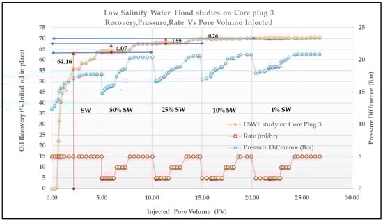 Effect of different parameters in low-salinity water flood study for core plug 3.