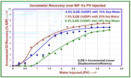 The experimental results indicated that a 25% seawater dilution yielded the highest incremental oil recovery (ILOR) of 7.5%. Notably, dilutions of 50% and 10% seawater salinity also resulted in significant ILOR values of 6.3% and 6.8%, respectively (Figure 8). Interestingly, the study found minimal performance difference between 25% and 10% dilutions, suggesting that 25% offers a balance between effectiveness and potentially lower treatment costs.