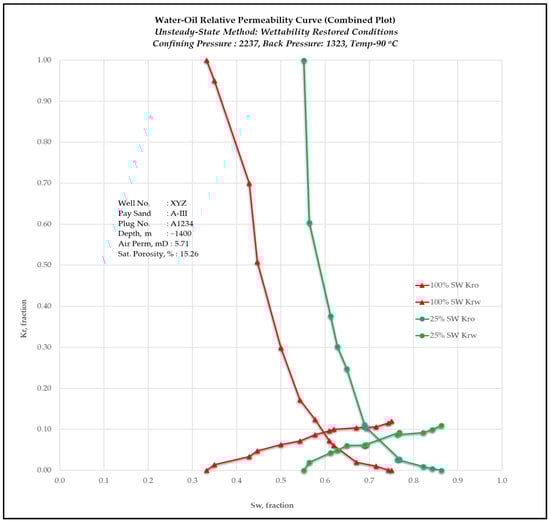 Wettability-restored core samples from reservoir A were utilized in the core flooding experiments. The study observed a significant improvement in oil recovery achieved through low-salinity water flooding compared to seawater flooding. Notably, residual oil saturation decreased by approximately 13 saturation units (Figure 9) under low-salinity flooding in imbibition mode. The findings from the core flood experiments, particularly the salinity-dependent oil–water relative permeability curves, are intended to be used as input data for reservoir simulation studies. These data will allow for a more accurate representation of the two-phase flow behavior under varying salinity conditions within the reservoir model.