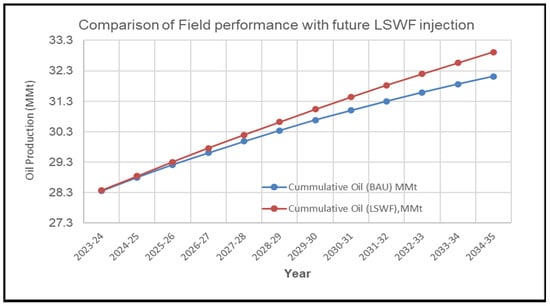 Salinity-dependent relative permeability curves, derived from laboratory experiments, were integrated into the simulation model. These curves predicted a potential reduction in residual oil saturation (Sor) of up to 13 units for low-salinity water (LSW) with a salinity of 8250 ppm. The model was then employed to simulate both a base case scenario and an LSWF prediction scenario. Production profiles were generated for both scenarios (Figure 11). Figure 11 depicts a predictive scenario for LSWF performance, developed through an upscaling approach that leverages laboratory data, field observations, and simulation results. The key findings from the pilot area simulation are summarized below: