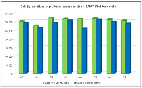 Figure 13. Salinity variations in produced water samples in LSWF pilot area wells. - Oil Rate Increase: A detailed analysis was conducted to assess the impact of LSWF on oil production rates and water cuts in producing wells. Approximately 10 wells exhibited a notable increase in oil rate alongside a corresponding decrease in salinity and stabilization of water cut (Figure 14).