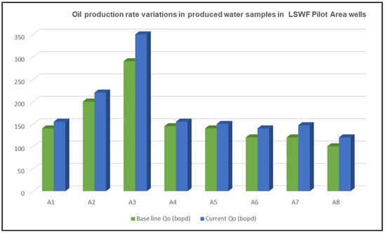 Figure 14. Oil production variations in produced water samples in LSWF pilot area wells. - Water Cut Reduction: Further stabilization or reductions in water cuts were observed at the well level (Figure 15), signifying a positive trend and potential improvement in overall oil recovery due to LSWF.