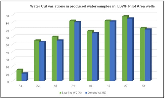 Figure 15. Water cut variations in produced water samples in LSWF pilot area wells. - pH Increase: Wellhead samples also indicated a positive sign, with an average pH increase from 7.3 to 7.6 observed during LSWF implementation.