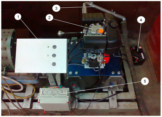 View of the research stand: 1—control panel, 2—research engine, 3—exhaust gas discharge system, 4—starting battery, 5—connection of measurement signals [78].